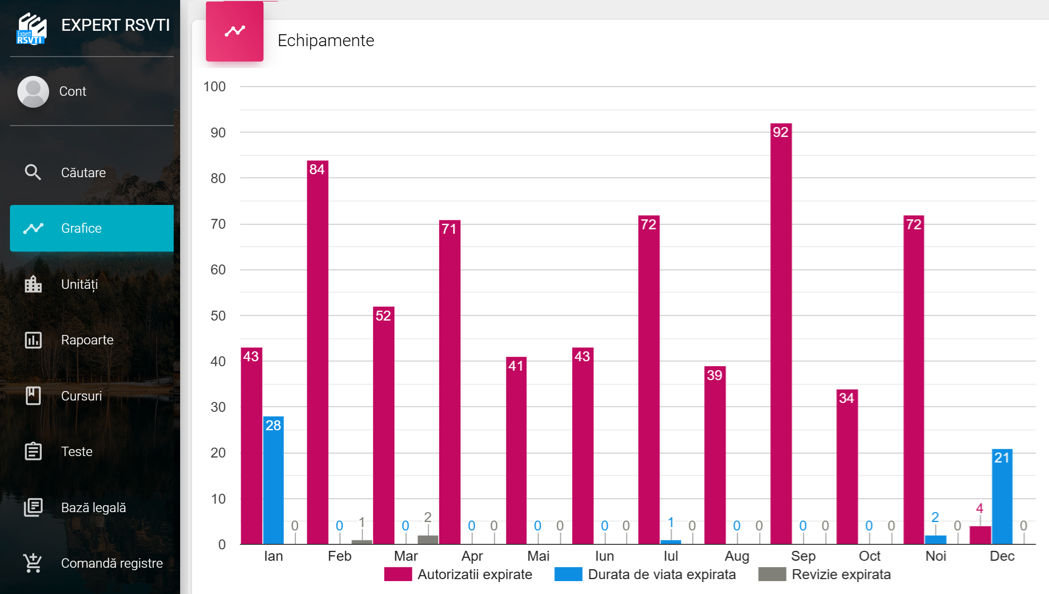 Vezi in grafice lunare scadențele echipamentelor si ale deserventilor. Dând click pe o bara din grafic se deschide o pagina cu echipamentele sau persoanele scadente, cu butoane pentru prelungirea autorizatiei.